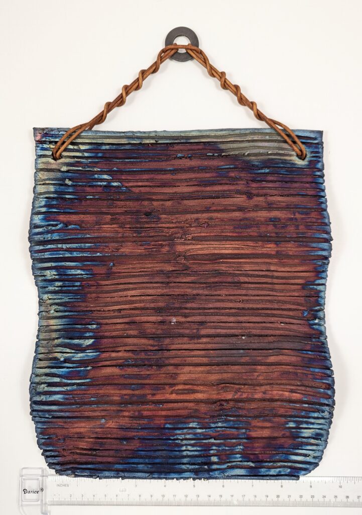 Description: Vertically aligned raku ceramic wall hanging. Built with two waves that curve away from the wall, raked horizontal lines give it texture and the raku finish give it additional depth.