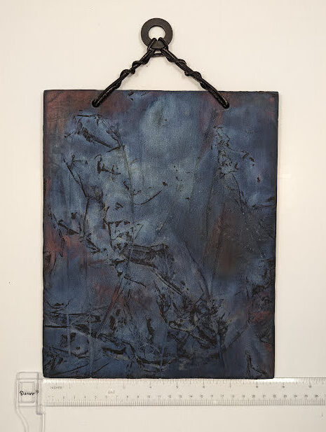 Description: Vertical aligned raku ceramic wall hanging decor. Organic and lace impressions give this a soft and playful texture. The Raku gives it depth.
